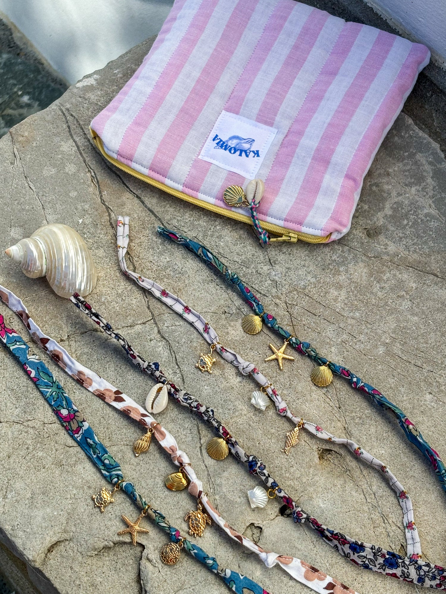 Bijoux en tissu et breloques comme des reflets d’eau et de soleil....