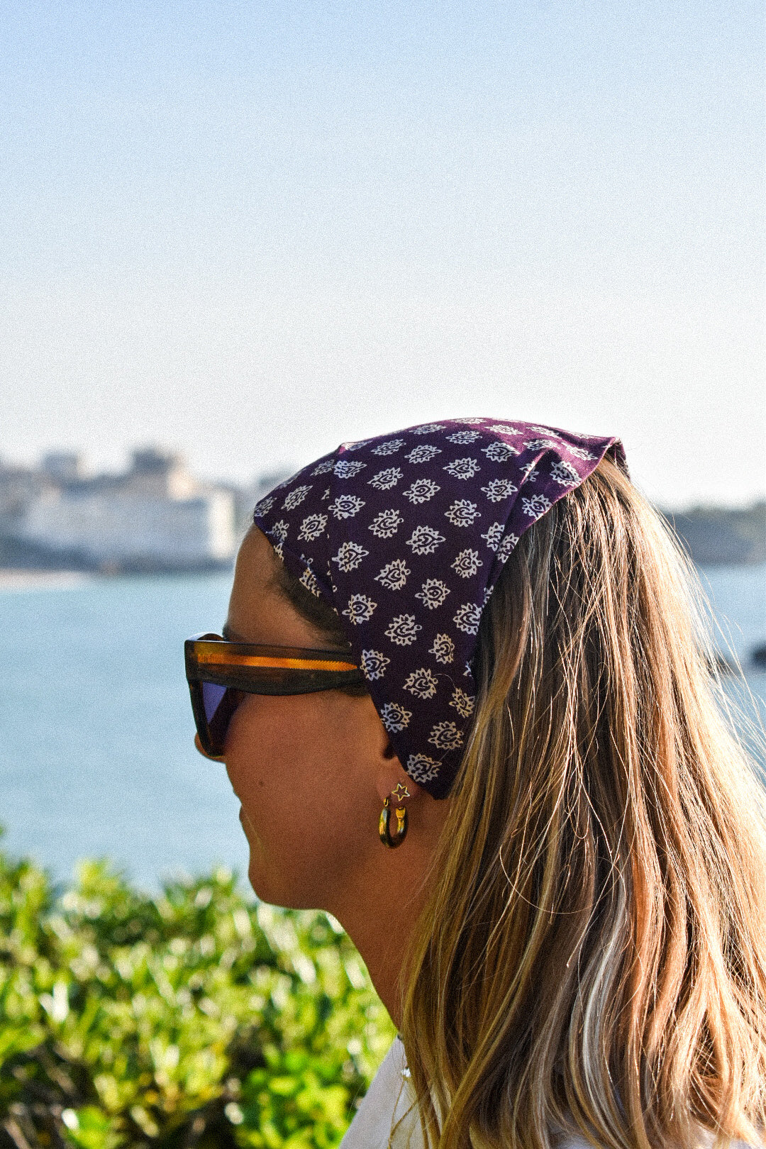 Apportez une touche bohème et colorée à vos coiffures avec le bandana Pruna, cousu à la main dans un tissu aux imprimés indiens dans de jolis tons de violet prune. Son style unique et raffiné sublime vos looks tout en restant confortable au quotidien.