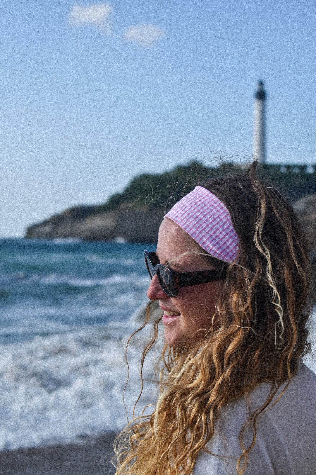 Ajoutez une touche intemporelle à vos tenues avec le bandeau vichy rose Babi, fait main avec soin sur la Côte Basque.