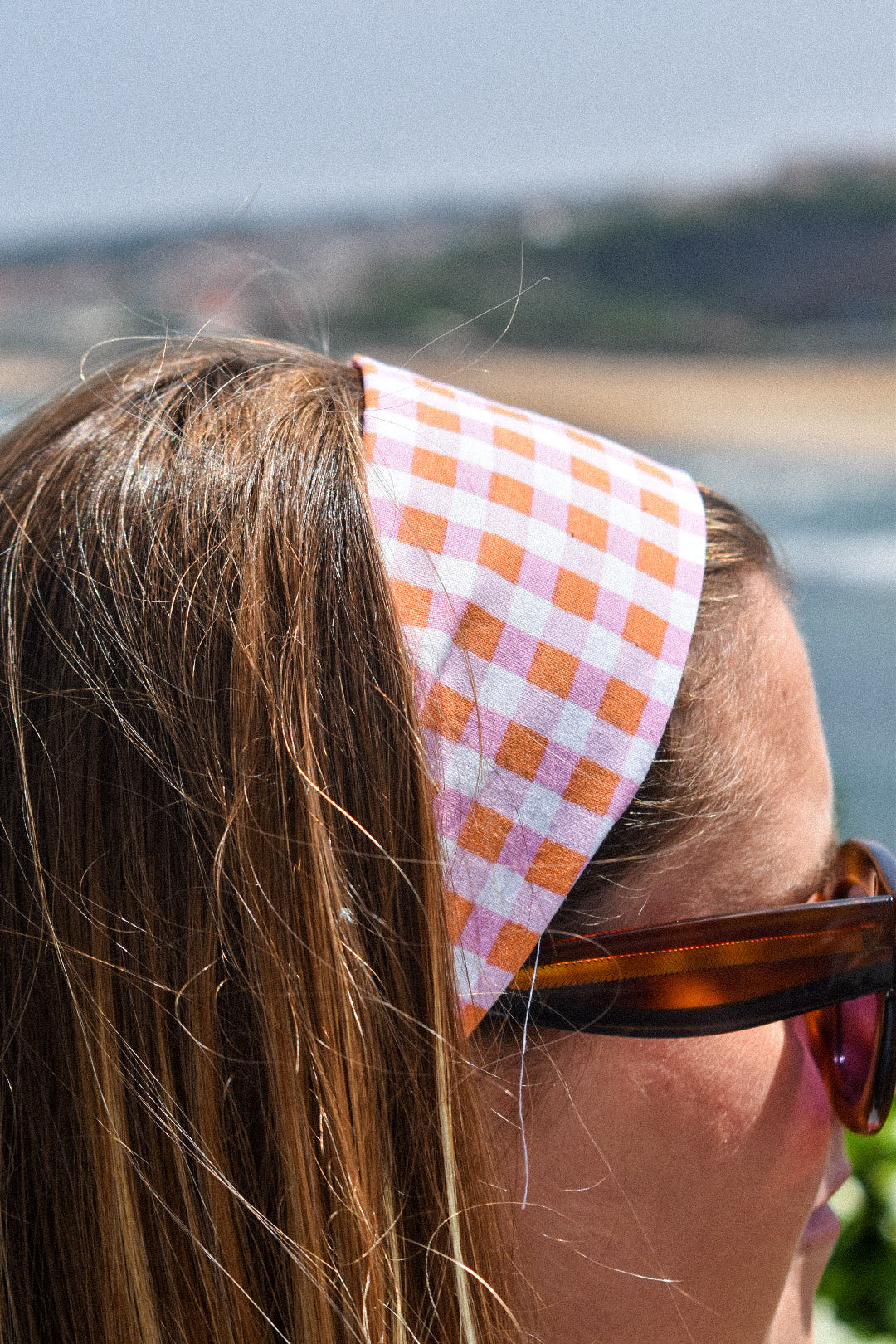 Apportez de la fraîcheur à vos jolis cheveux avec le bandeau Bella, cousu main dans un tissu vichy rose et orange éclatant. Son motif rétro et coloré illumine vos tenues avec ce bel accessoire féminin.