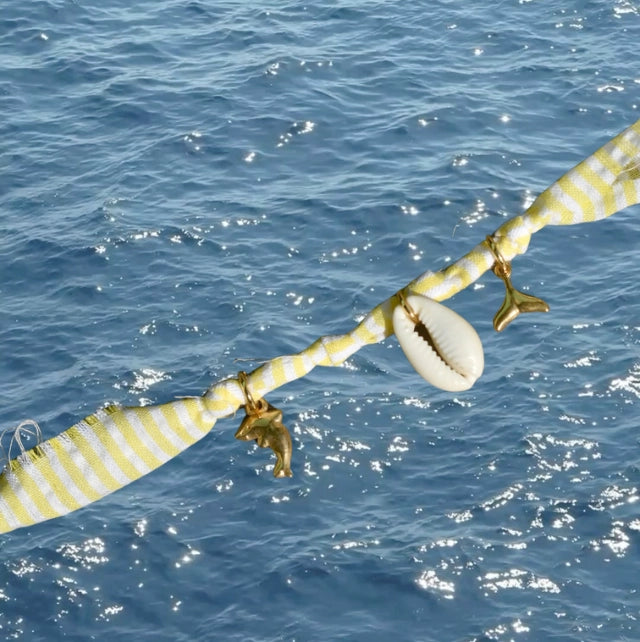Les bracelets de l’océan Kalomia sont de petits trésors pleins de charme, nés des chutes de tissus de l’atelier. Chaque ruban se transforme en un bijou unique, à nouer autour du poignet, orné de breloques marines qui sentent bon les embruns et les vacances. À porter seul ou en accumulation, pour un look bohème et iodé.