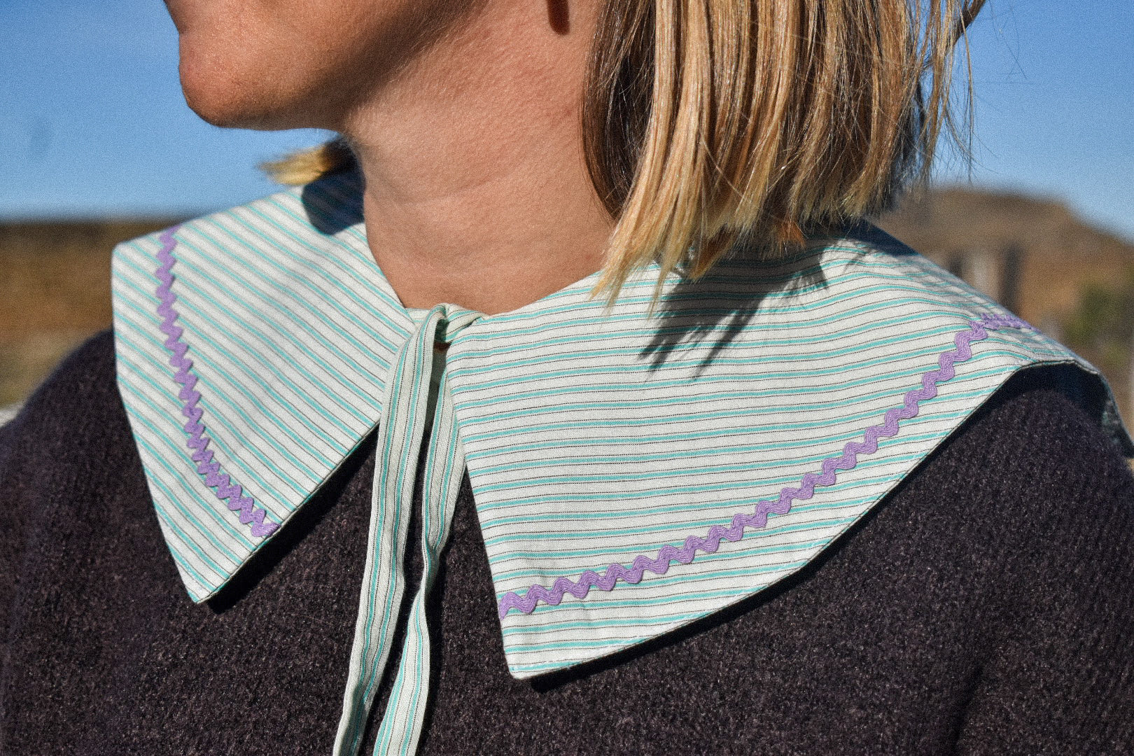 Confectionné à partir de tissus upcyclés, chaque col est une pièce unique, inspirée par les nuances du littoral — le blanc des embruns, le bleu des horizons, la chaleur du sable.