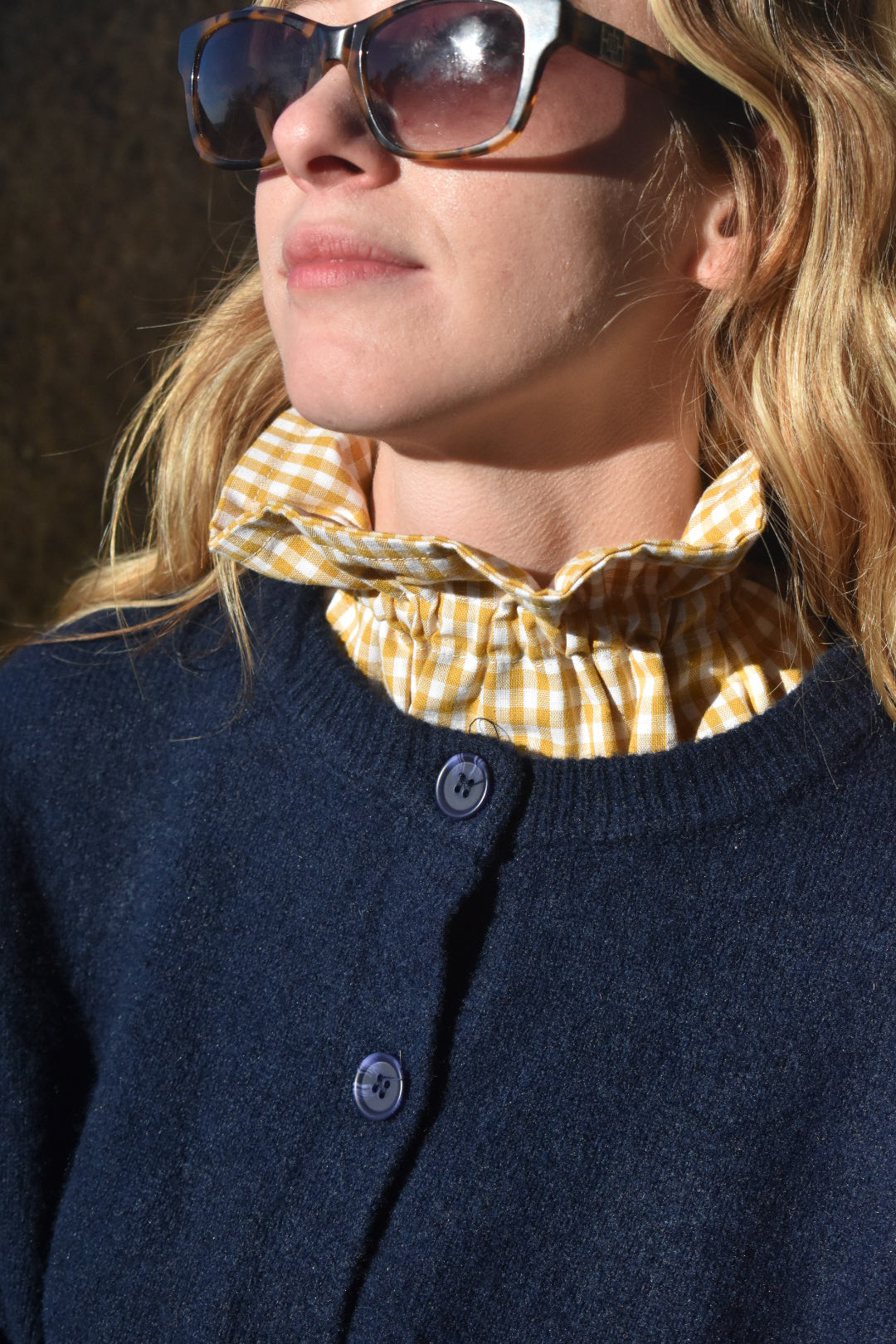 Ajoutez une touche d’élégance rétro à vos tenues avec le col victorien Kalomia, cousu à la main et avec soin dans un joli tissu vichy moutarde. Inspiré du charme d’antan, il habille vos pulls, chemises ou robes d’un souffle romantique et raffiné.
