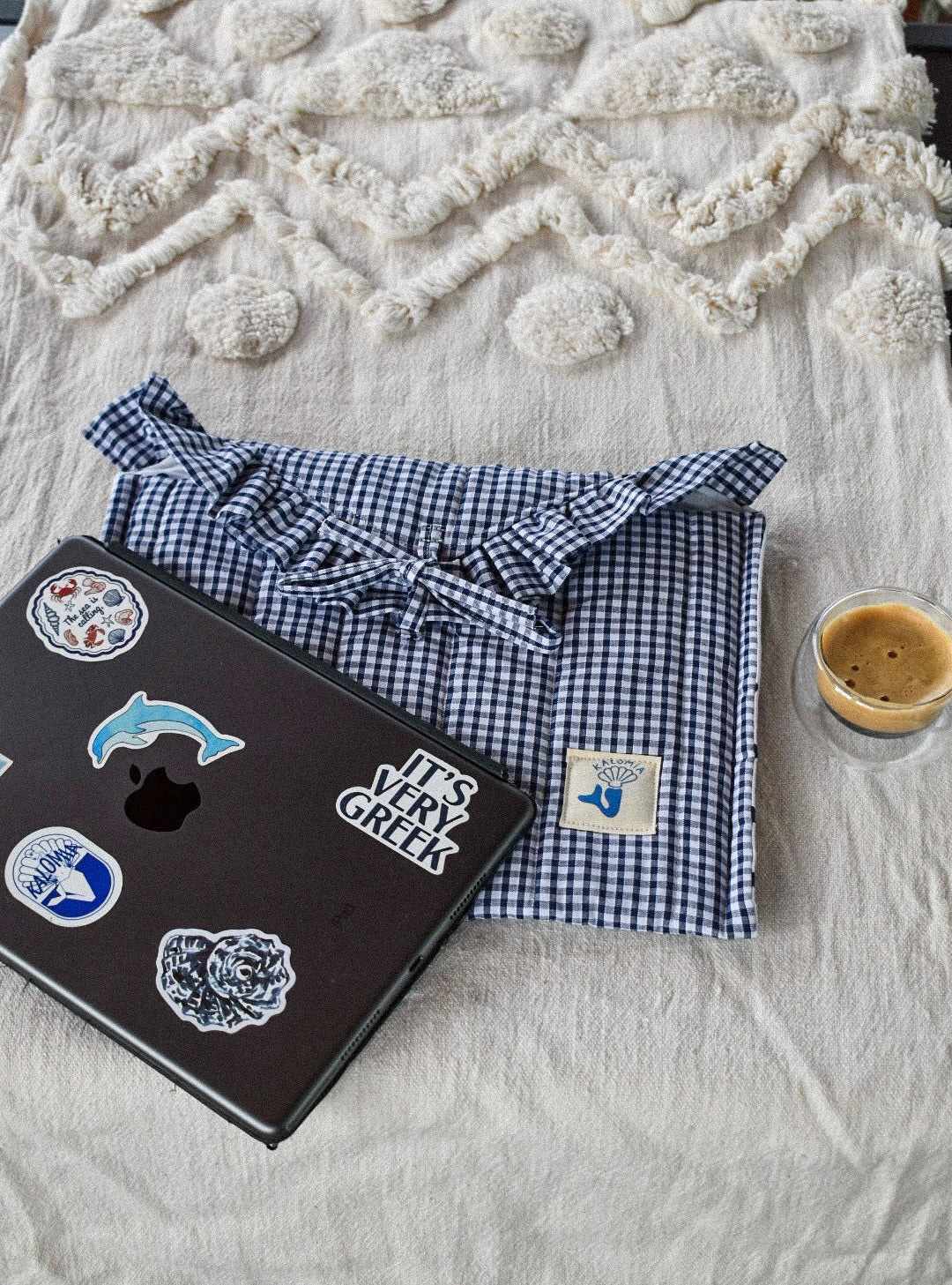 Protégez votre iPad avec élégance grâce à la pochette matelassée Kalomia, confectionnée dans un joli tissu vichy. Son design doux et structuré est rehaussé de volants sur l’avant, pour une finition délicate et féminine. La fermeture se fait à l’aide d’un lien à nouer, pratique et esthétique, qui maintient votre tablette en sécurité.