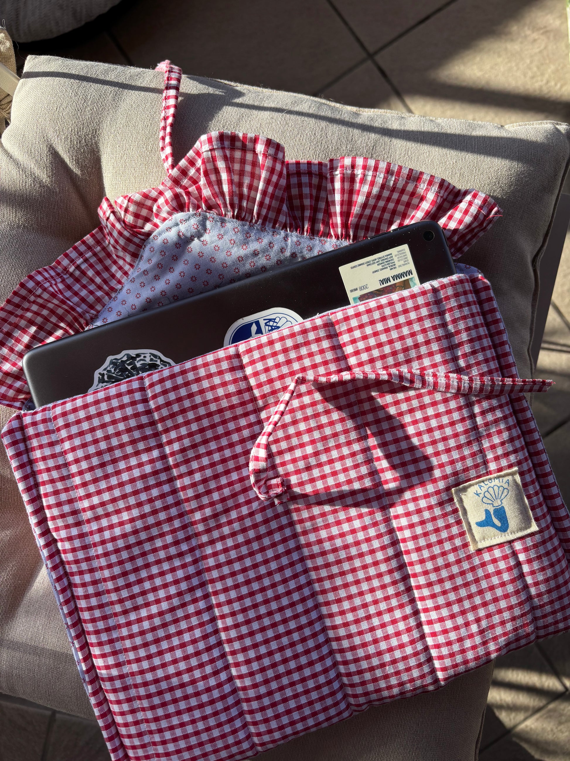 Protégez votre iPad avec élégance grâce à la pochette matelassée Kalomia, confectionnée dans un joli tissu vichy. Son design doux et structuré est rehaussé de volants sur l’avant, pour une finition délicate et féminine. La fermeture se fait à l’aide d’un lien à nouer, pratique et esthétique, qui maintient votre tablette en sécurité.